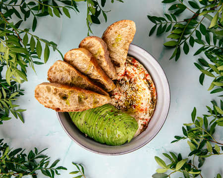 Hummus bowl with sliced avocado and toasts