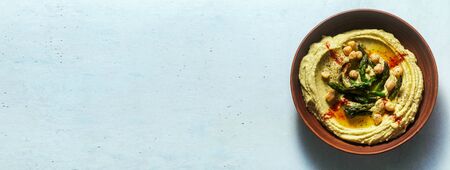 banner of hummus with green asparagus. spring alternative recipe