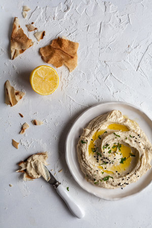 Hummus traditional middle eastern homemade appetizer healthy vegan paste snack flat lay with natural ingridients, tahini, paprika, olive oil, pitta. Healthy vegetarian diet nutrition protein food