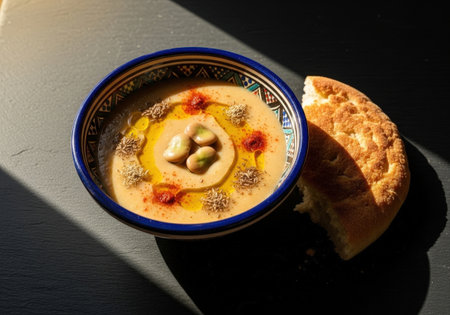 A delicious bowl of traditional Moroccan bissara. The fava bean soup is garnished with cumin and paprika and served with fresh bread in warm sunlight.