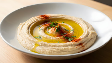 Studio Food Photography of Gourmet Hummus Spread Garnished with Tahini and Paprika for a Modern Aesthetic