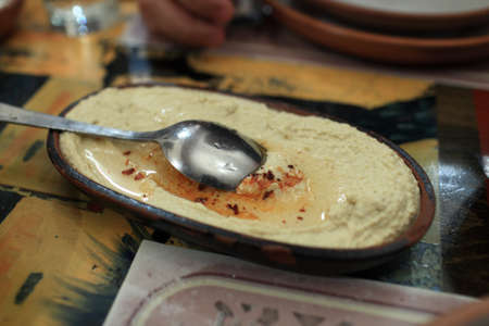 Plate of hummus is in an armenian restaurant