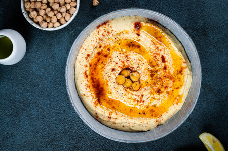 Hummus with olive oil and spices on a dark background with ingredients. Top view, copy space.