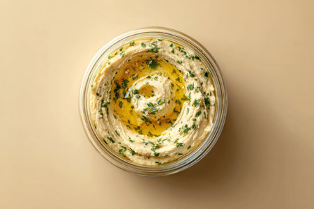 Hummus in Clear Container with Herb and Oil Swirl on Beige Background