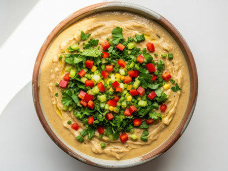 This image features a bowl of creamy hummus topped with diced vegetables and herbs, all isolated on a white background. The bowl is filled with hummus and garnished with chopped red peppers, green onions, and cilantro, creating a visually appealing and appetizing dish. The white background enhances the focus on the food, making it stand out clearly.