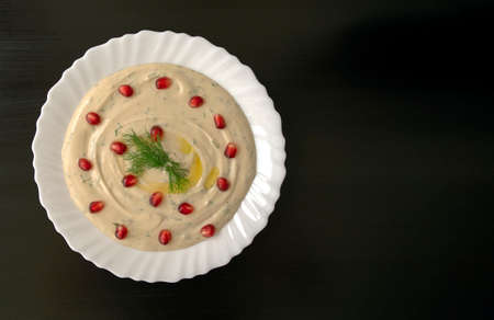 Famous traditional Arabic, Eastern and Israel cuisine - dip Tahini with pomegranate on dark wooden background with copy space. Top view. Tahina sauce.