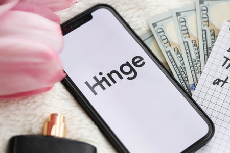 KYIV, UKRAINE - FEBRUARY 23, 2024 Hinge logo of famous dating website or app on iPhone display screen close up