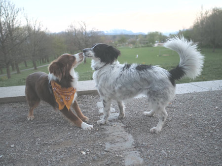 Red merle Border Collie puppy meets a brown mongrel dog on green grass, friendly interaction and playful curiosity outdoors