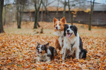 Three sad homeless wet dogs sitting on the street during the rain. High quality photo