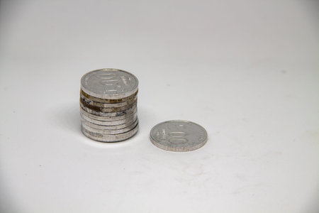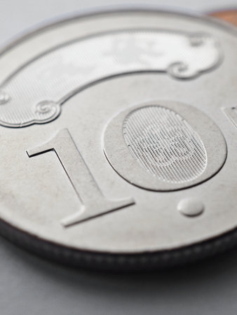 Japanese ten yen coins on both sides stand on a white background. Fragments of close-ups. not isolated. Picture with high contrast, sharpness and saturation. Shot with a macro lens