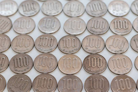 A field of Japanese coins in 1 yen, on it lies a coin of 100 yen. News about the economy, finances and interest rate of the central bank of Japan. deposits and loans. Macro
