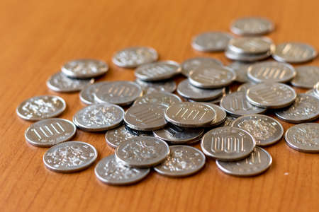 View a lot of 100-yen coins on the desk from directly above