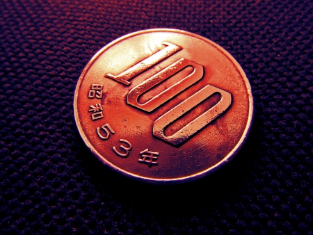 Japanese 100-yen coins on a wooden desk