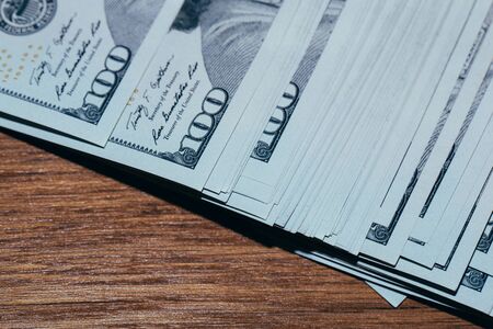 Fan of paper one hundred dollars banknotes on wooden table. Heap of money