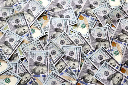 Close up of 100 dollar bills as a background. Amarican dollars pattern. Top view of business concept.