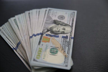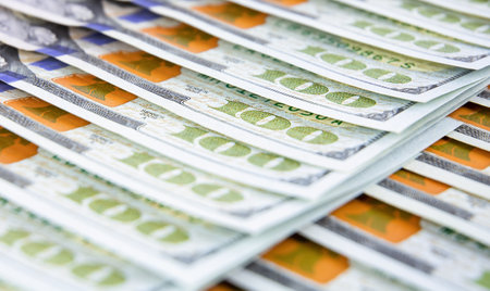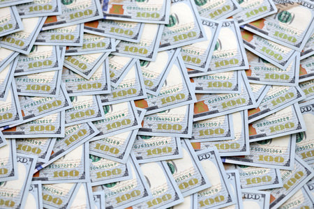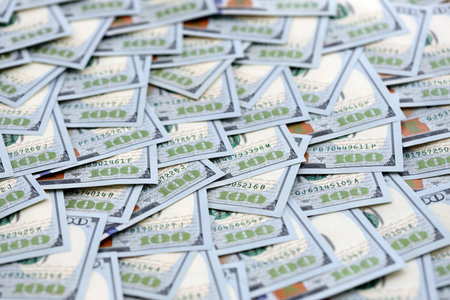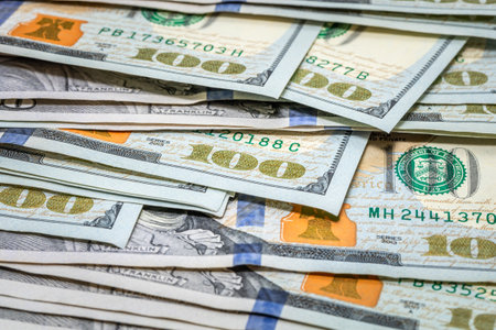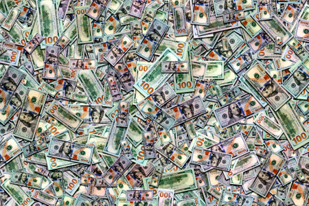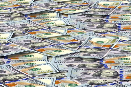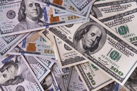 A pile of one hundred US banknotes with president portraits. Cash of hundred dollar bills, dollar background image with high resolution.