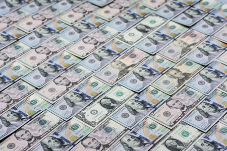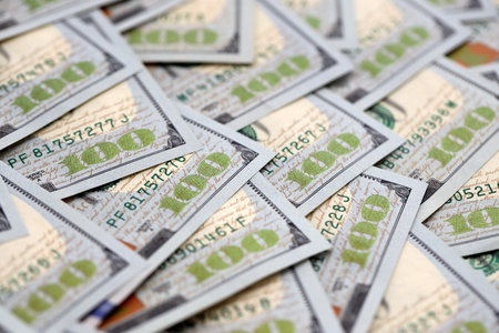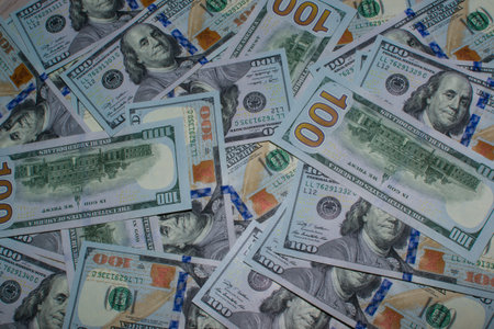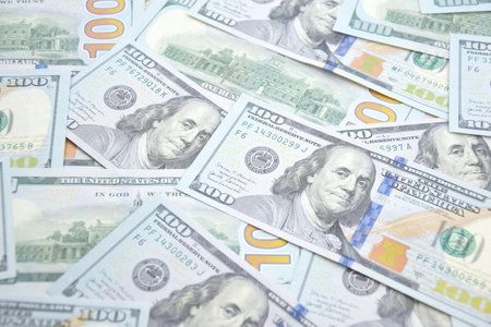 Top view of one hundred dollar banknotes made as a background. USD currency concept. Texture of American dollars.