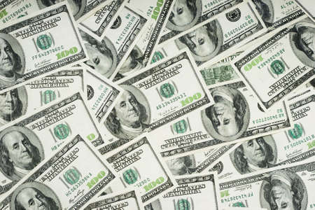 background of a many new 100 US dollar banknotes with a portrait of US President Benjamin Franklin