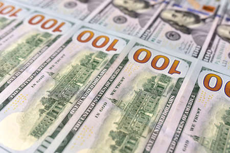 US one hundred dollar bills background. Money american hundred texture notes design. Financial concept. Financial operations