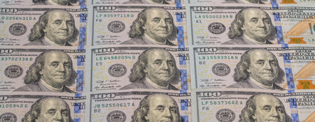 One hundred American dollars background. A row of one hundred dollar bills standing for US dollar exchange rate, money, earnings, or salary.
