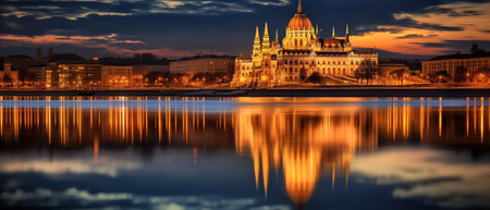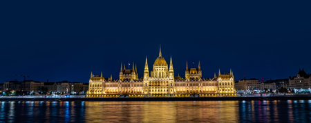 Panoramic view of the Parliament building in beautiful night lighting in Budapest