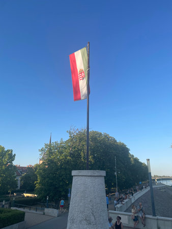 Hungarian flag waving atop a high pole against a clear Budapest sky, embodying the nation's pride and heritage under open skies in a peaceful setting.