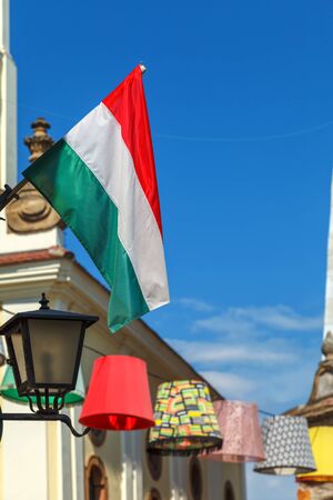 Tricolor red, white and green Hungarian national flag waving on the wind in the city.