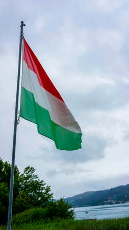 Hungarian flag waving over cloudy sky. High quality photo