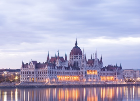 The Hungarian Parliament Building on the bank of the Danube in Budapest at evening