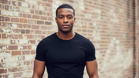 A man in a black t-shirt stands centered against a weathered brick wall. The portrait highlights his dark hair and facial hair, enhanced by neutral lighting. The composition suggests a studio setting, suitable for promotional or editorial material. The image could be used for various purposes.