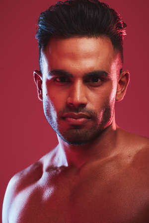 Closeup portrait of one fit and strong handsome mixed race man isolated against a red background in a studio and posing shirtless. Headshot of serious and focused hispanic man looking determined