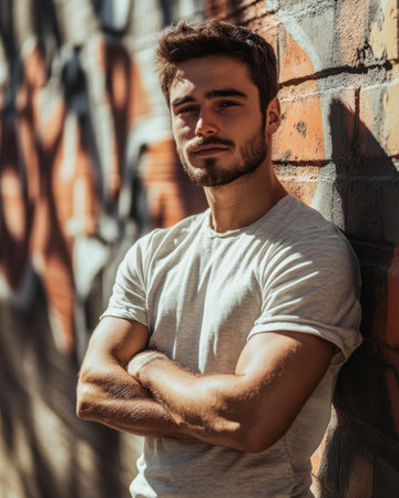 A young man in a casual outfit leans against a vibrant graffiti-covered wall, crossing his arms and smiling slightly as sunlight casts gentle shadows on his face.