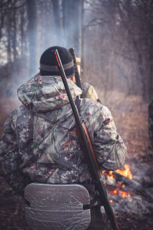 Hunter with gun at campfire in forest during hunting season. View from behind