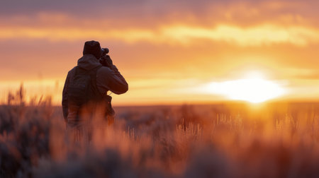 A person in camouflage clothing is focused on capturing images of nature with a camera in a tranquil field filled with dried plants under soft morning light.
