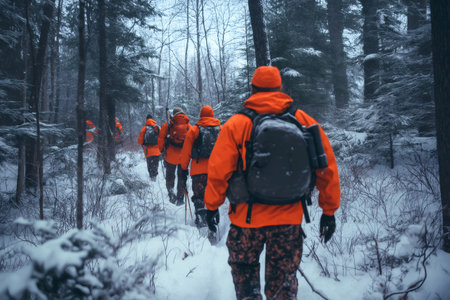 Hunters trekking in single file through a snowy forest during the chill of winter hunting season, clad in orange gear and camouflage