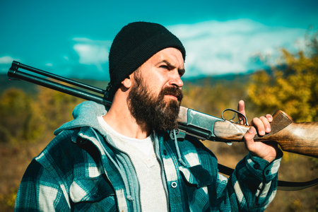 Closed and open hunting season. Hunter with shotgun gun on hunt. Close up Portrait of hamdsome Hunter.