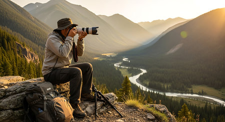 Photographer taking picture of beautiful mountain landscape at sunset. Travel and nature concept