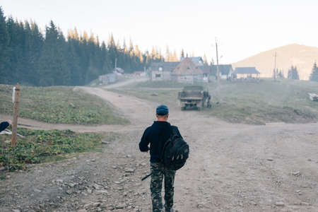 Tourist trip on the slopes of the mountains. A man travels in the mountains.