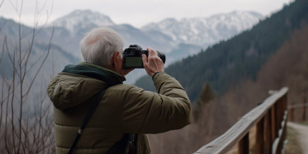In a rugged mountain landscape, a photographer with a large lens captures the image of a curious wild canine. The encounter happens amidst the vivid green of alpine grasses, under the sharp gaze of the mountain peaks beyond. AI generation