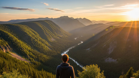 A lone hiker stands amidst a dense forest with autumn colors, preparing for an adventure in the wilderness during the early morning hours