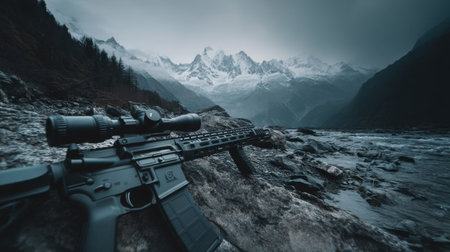 This striking image captures an assault rifle resting on rocky terrain beside a river, framed by majestic snow-capped mountains under an ominous sky.