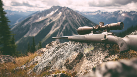 A precision rifle rests on rocky terrain with majestic mountains and a cloudy sky in the background, perfect for outdoor enthusiasts and adventurers.
