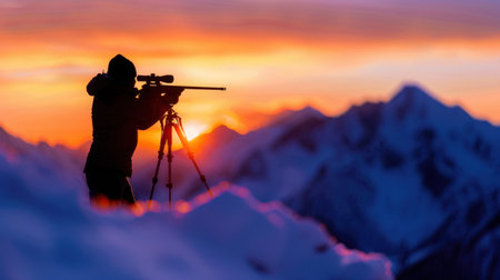 A stunning silhouette of a hunter setting up a telescope against a breathtaking mountain sunset. The vibrant colors and tranquil landscape create a perfect atmosphere for outdoor exploration.