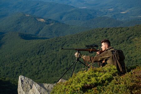 Man brutal gamekeeper nature landscape background. Walking in mountains. Hunting masculine hobby concept. Regulation of hunting. Hunter hold rifle. Nice day for hunt. Hunter spend leisure hunting