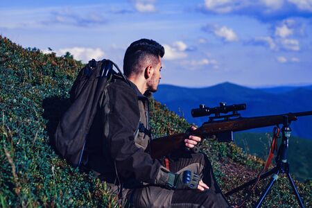 concentrated man ready to fire. hunter hobby. military male in camouflage. soldier in the field. polygon. army force. sniper reach target mountain. muscular man hold weapon. purpose and success