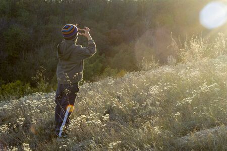 hunter with a gun stands in the reeds and aims at the prey. against the background of a bright sunset in autumn