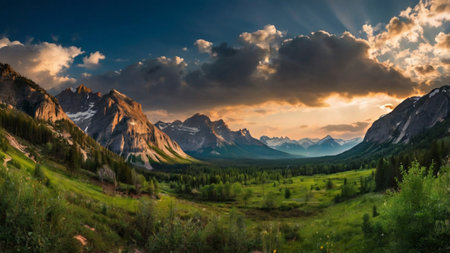 Golden Meadow at Sunset: Majestic Mountains in the Distance