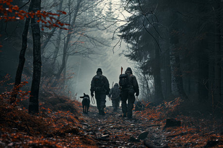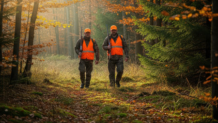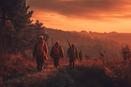 Hunters with equipment walking away at sunset through a forested landscape in autumn, preparing for an adventure in the wilderness
