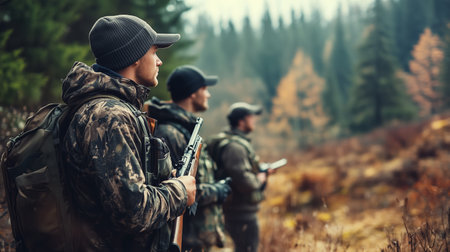 Three hunters observing their surroundings in a dense forest during autumn, carefully scanning for wildlife