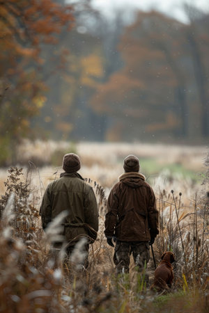 A young hunter and his mentor prepare for a day in the field, surrounded by tall reeds on a cool morning in nature